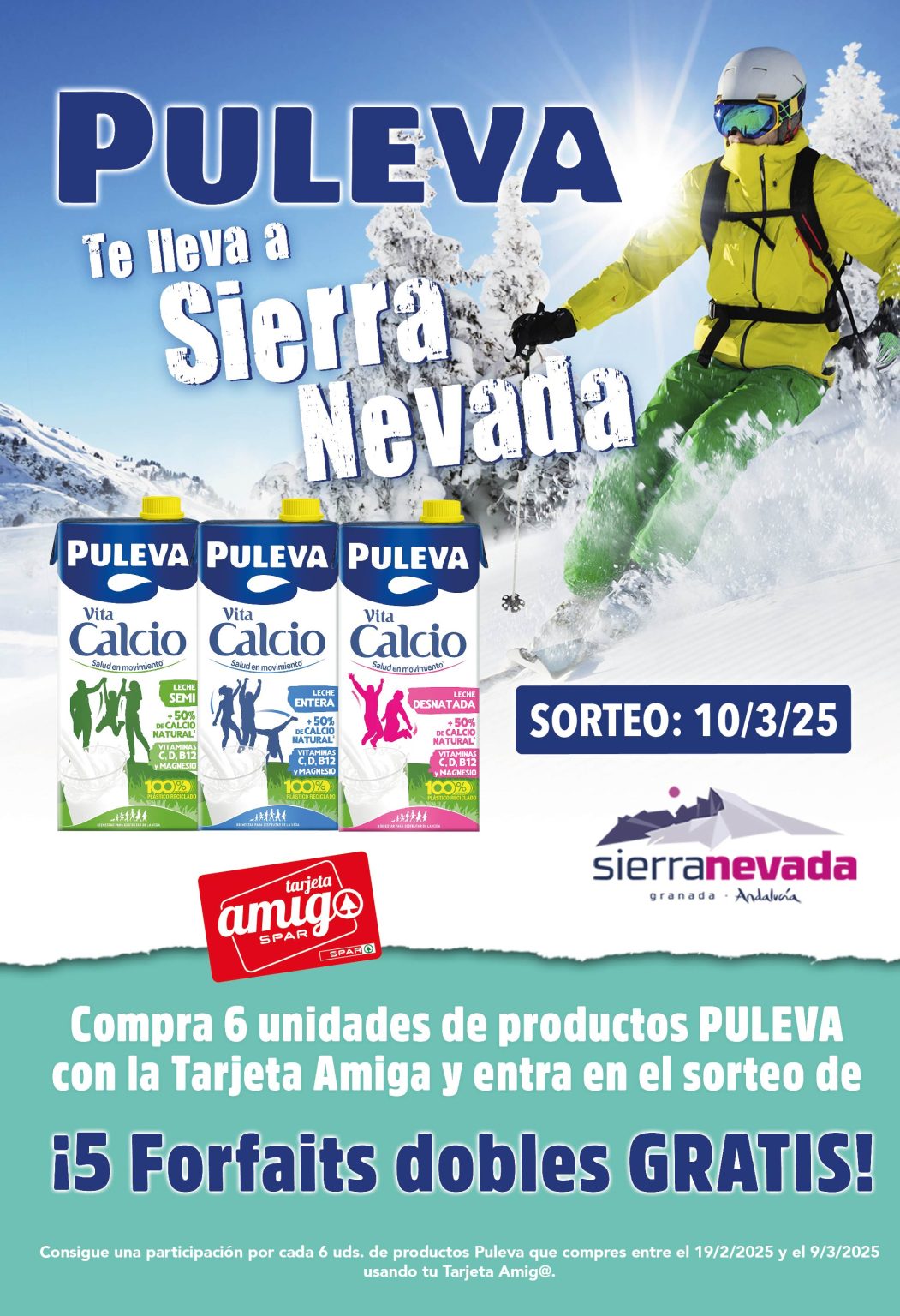 Compra 6 unidades de cualquier producto de la marca PULEVA utilizando tu Tarjeta Amig@ y participa automáticamente en el sorteo de 5 forfait dobles completamente gratis.